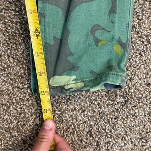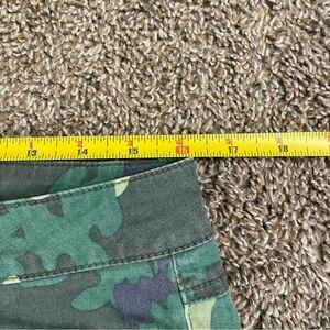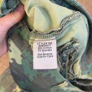 CAbi slim pants in a classic green camouflage print. Front button closure with decorative metal button.