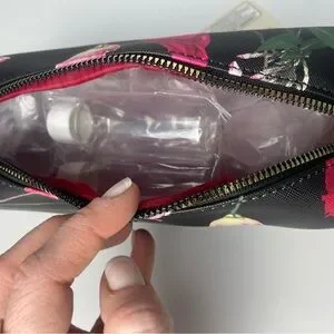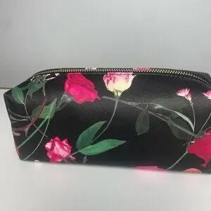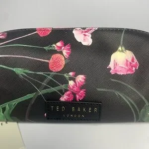 Sleek Ted Baker cosmetic bag with floral print. Black exterior with pink and green floral accents. Gold-toned Ted Baker logo plaque. Zip closure for secure storage. Lightweight and travel-friendly.
