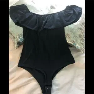 Flirty off the shoulder body suit snap closure for an adjustable fit.