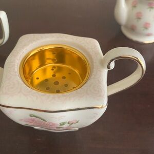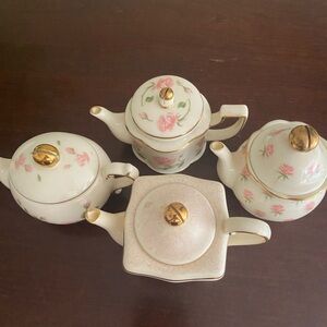 These are from the 2002 collection, cream colored porcelain, decorated with pink roses and gold accents, designed to hold tea lites , includes various tea pots in different shapes. Excellent condition no chips, cracks or repairs.