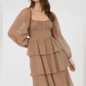 Flowy tiered midi dress with long bishop sleeves. Smocked square neckline and fitted waist. Lightweight layered skirt for soft movement. Neutral taupe tone for versatile styling.