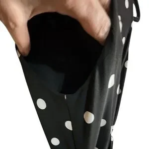 Stretchy, soft sleeveless midi dress with classic polka dot print. Self-tie waist creates a flattering silhouette. Flowy skirt offers graceful movement. Timeless pattern for versatile wear.