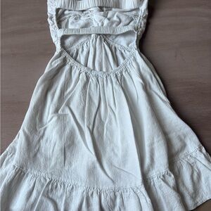 Cream strapless casual dress with a front twist bodice and gathered skirt. Lightweight, breathable fabric for comfortable everyday wear. Elasticized back for a secure fit and easy on-off. Has rubber grips along top of front to stay up. Versatile cream shade that pairs well with sandals or a light cardigan.