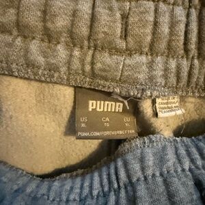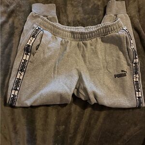 PUMA gray jogger sweat pants size XL with white stripe and black “puma” logo writing down the inside of the stripe! PUMA on the left side of left leg logo as well!