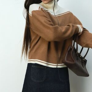 Stylish H&M sweater with a zip-up front. Features a brown body with cream accents. Perfect for casual wear.