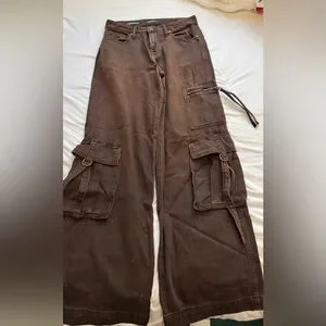 Dark brown cargo pants with multiple pockets. Rugged design for versatile style.