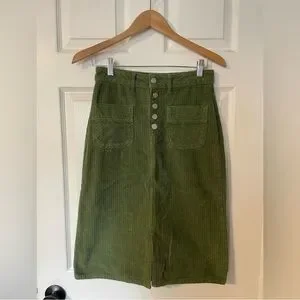 Chic midi skirt in forest green. Features button front and pockets. Ideal for versatile styling.