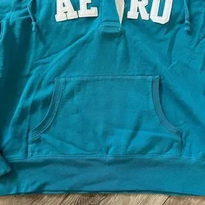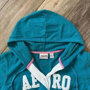 This cozy vintage Aeropostale pullover sweatshirt features a V-neckline with buttons in a beautiful teal blue hue. Signature embroidered “AERO” logo on the chest adds that nostalgic early-2000s touch.