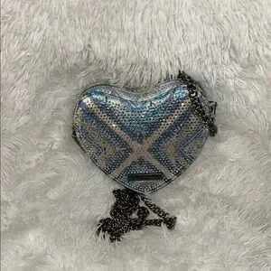 Heart-shaped mini crossbody in blue with silver accents. Sparkling crystal chevron pattern across the front. Gunmetal chain strap for hands-free wear. Statement piece for evening looks.