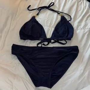 Classic triangle bikini set by La Blanca. Textured fabric adds subtle detail. Halter ties with gold-tone accents. Comfortable mid-rise bottoms. Versatile navy blue shade.