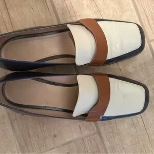 Classic leather loafers with a cream vamp, brown strap, and navy trim. Sleek square toe design. Versatile and polished look.