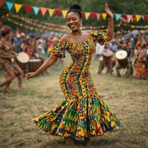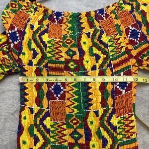 Vtg Smocked Kente African Maxi Dress Free Size World Dance Cultural Festival
