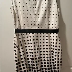 Elegant sleeveless midi dress in white with black polka dots. Features a slim black belt to define the waist and create a polished silhouette. Lightweight, versatile piece perfect for daytime events or the office. Classic two-tone pattern for easy styling.