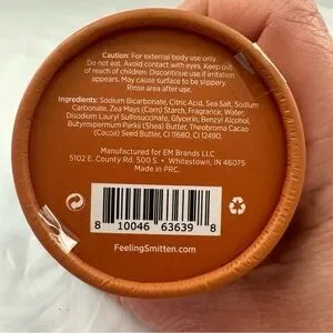 Ingredients include sodium bicarbonate, citric acid, sea salt, cornstarch, fragrance, glycerin, shea butter, cocoa butter, and more.