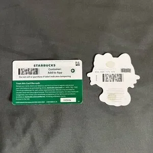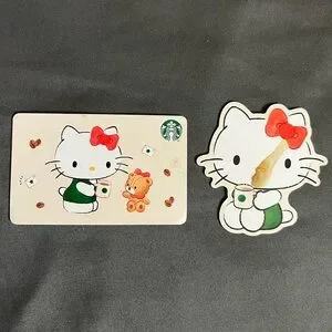 Cute Hello Kitty Starbucks-themed card and matching sticker. White base with red bow and green outfit accents. Graphic collectible for fans. Great for display or gifting.