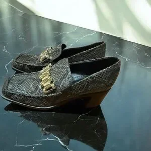 Zara loafers with snakeskin-effect textured upper. Square toe silhouette. Decorative gold-tone chain across the vamp. Leather-lined interior. Sleek low heel for easy wear.