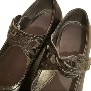 Chic and supportive Naot Luma Mary Jane heeled pumps in black leather with glossy cut-out patent straps. These shoes feature a stable block heel and contoured footbed for all-day comfort. Perfect for work, evening outings, or dressy occasions. European size 38 fits like US 7–7.5.