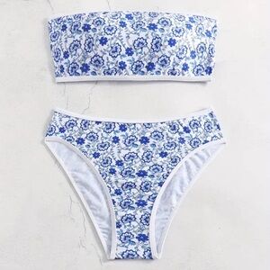 Keywords: bikini, high-waisted, bandeau, floral, summer, beach, swimwear, adjustable fit, lace-up, cheeky coverage, strapless, women's swimwear, blue bikini, two-piece, vacation.