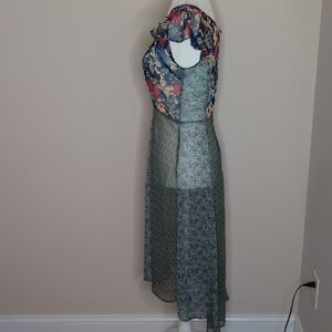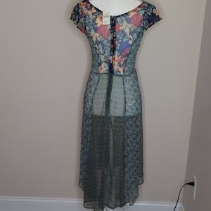 Lightweight midi dress in teal and navy with mixed floral panels. Square neckline and flutter cap sleeves create a feminine silhouette. A-line skirt offers easy movement and everyday wearability. Perfect for daytime events and casual outings. Unlined so you would have to wear something under it.