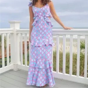 Simply Southern Ruffled Shell Print Maxi Dress in Pink & Light Blue XXL NWT