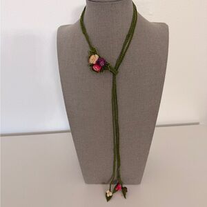 Elegant Turkish handcrafted long lariet necklace featuring delicate flower motifs on a green cord.. Very similar to American tatting. This is the most miniature flower the Turkish women make Lightweight and versatile for layering or wearing solo. Approx. 22”length