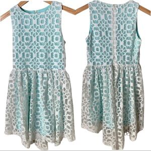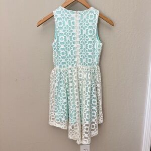 Girls Size 10. Like new condition - clean, steamed & ready to wear! Two layers - white Laser cut lace design on the overlay. Tiffany blue color peeks thru from the first layer. Slight high/low hem. 100% Polyester. Zipper on back. Approximate measurements (taken when laying flat - cannot guarantee fit):