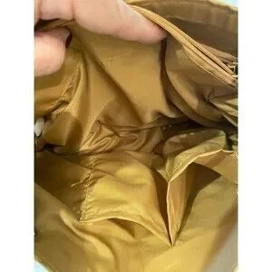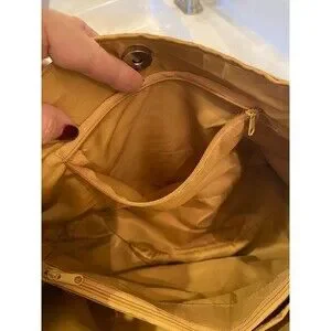 Has 3 Large Compartments-center one zips shut. Also w/zippered pocket on one side and 2 open pockets on opposite side