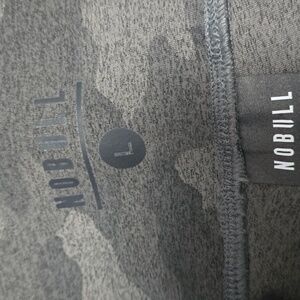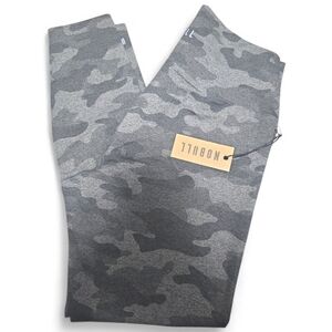NOBULL high-rise women's leggings in charcoal gray camo. Soft, stretchy fabric for comfort and full-range movement. Flattering fit with secure waistband for workouts or everyday wear. Camouflage pattern adds subtle style.