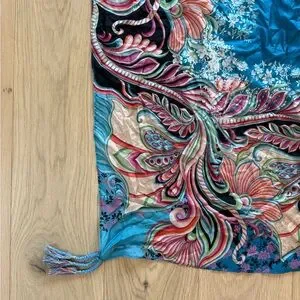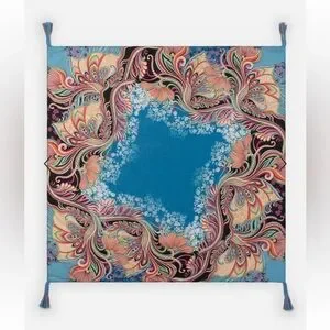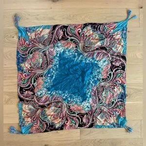 New with Box • Johnny Was - Crafted from luxurious 100% silk, the Scroll Silk Scarf is adorned with a beautifully rich pattern in vibrant tones. Thoughtfully designed to enhance any look, this square scarf is finished with tassels at each corner for added texture. Tie at the neck or at the handle of your favorite back for a pop of color.