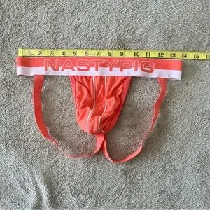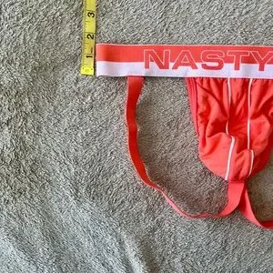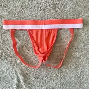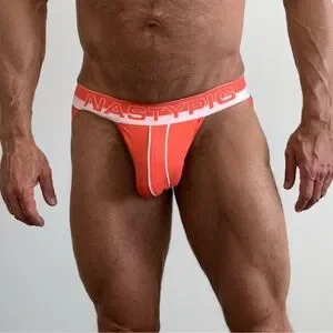 Eye-catching orange jockstrap with sleek white trim. Nasty Pig logo on waistband.