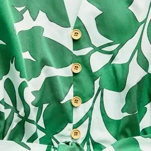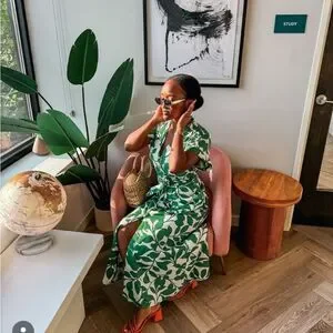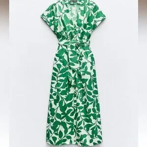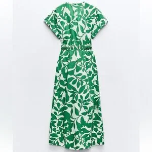 V-neck midi dress with short sleeves. Self belt with back elastic. Front pockets. Front button closure.
