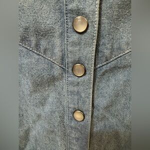 Vintage chambray/lightweight denim maxi skirt with snap closures up the front and dainty embroidered details!