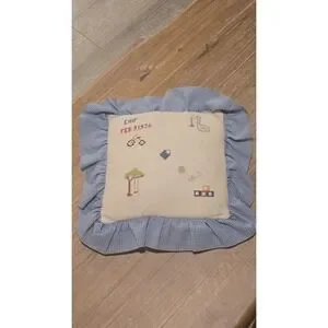 This is a vintage handmade, ruffled, cross-stitch accent pillow with a kid theme. Dated "Feb 9, 1978"
