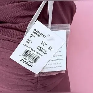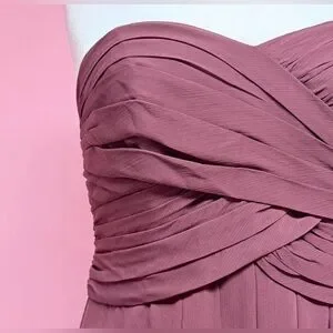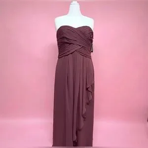 This elegant David’s Bridal strapless evening gown features a beautiful wine color, perfect for special occasions. The draped design adds a touch of sophistication and style. This dress has a very elegant ruffle detail, and is new with tags. This item has been tried on. It may show signs of wear that include loose threads, drag dust, or other small imperfections. Please review all photos and ask questions before purchasing. All items I sell are “as is”. It is a size 16. Approximate measurements are as follows: