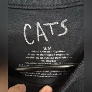 The product is a black T-shirt in women's size small, featuring an oversized fit inspired by the Broadway musical "Cats." The design of the shirt incorporates elements from the movie and musical, making it a unique and stylish addition to any wardrobe. The brand associated with the shirt is Broadway, adding a touch of Theater and Arts to the casual yet fashionable piece of clothing.
