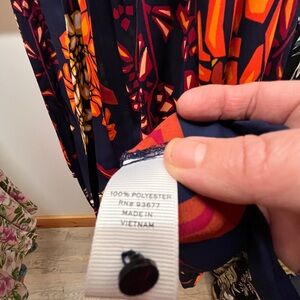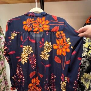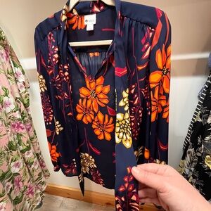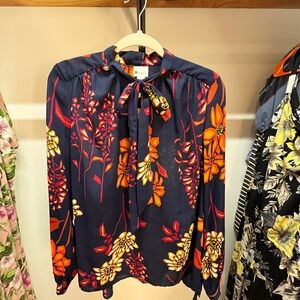 Navy blouse with vibrant orange and cream floral print. Features a feminine tie-neck. Long sleeves and soft drape. Bold botanical design for easy styling.