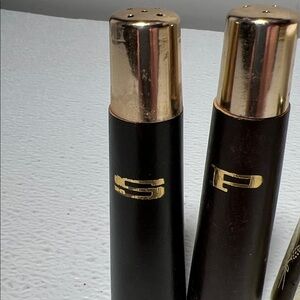 Matching brown shakers with gold caps and initials.