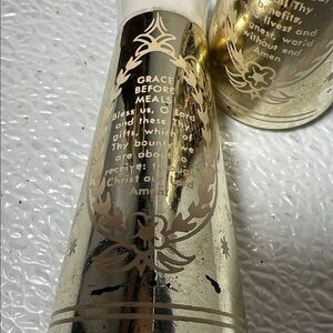 Glass gold shakers have a Grace Before Meals pray on it.