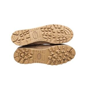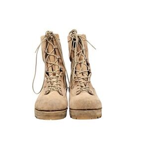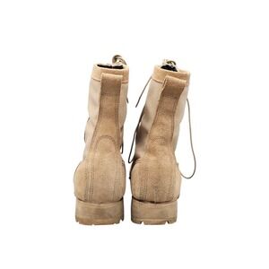 EXCELLENT USED CONDITION! Belleville Men's Size 9 R US tan suede army Vibram sole Gore-Tex combat boots are durable and stylish footwear designed for outdoor activities and workwear. With a round toe shape, lace-up closure, and mid-calf shaft style, these boots offer both comfort and functionality. Featuring Vibram outsoles and Goretex technology, these boots are perfect for summer, fall, and spring seasons. Made with high-quality leather and synthetic lining material, these boots are a reliable choice for those looking for a sturdy and reliable pair of boots with an army-inspired theme.