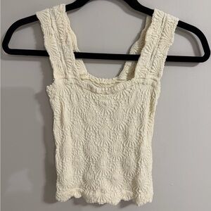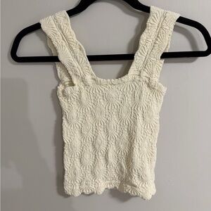 Creamy white textured tank with wide straps. Square neckline and fitted silhouette. Subtle raised floral-like pattern for added interest.
