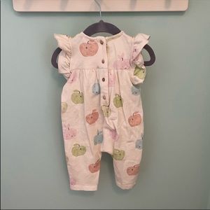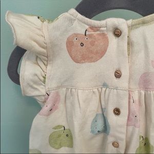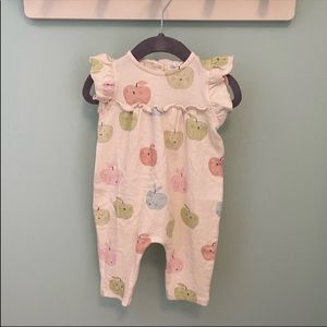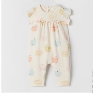 Zara Apples Jumpsuit Round neck short sleeve iumosuit with ruffle trim. Back button closure. Ruching detail at chest. All- over print. Size 3-6 months New with tags