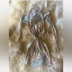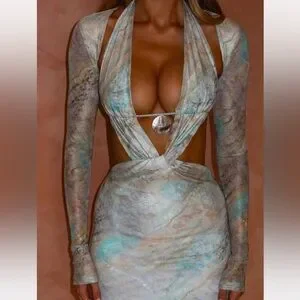 Crafted from printed mesh fabrication and lined in soft polykinit, Lorelai is designed to flatter with a bodycon fit and mini length silhouette. The halter neckline plunges into a deep V'accented by a shell embellishment at the bust, while the twist detail at the waistband enhances your curves. Featuring a separate long-sleeve bolero for a versatile, layered look and adjustable neck and back ties for a customizable fit, she ensures comfort and style from every angle.