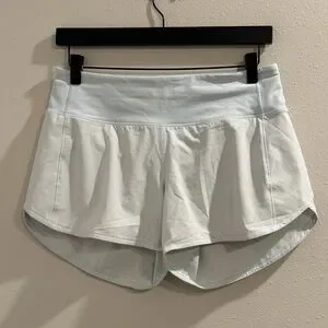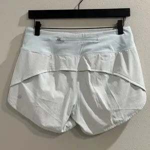 These Lululemon Size 6 Powder Blue Speed Up Shorts are designed for high-performance running with a 4” inseam and built-in lining for extra coverage and comfort. Featuring a flattering waist of approximately 29” and a rise of 11.5”, they offer a sleek, supportive fit. Perfect for workouts or casual sporty looks, these shorts are in excellent condition and ready to elevate your activewear collection.