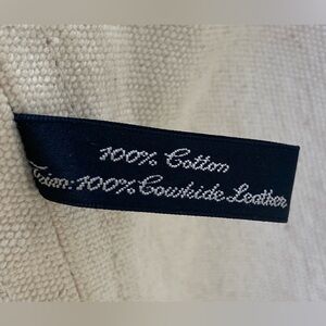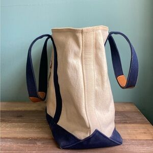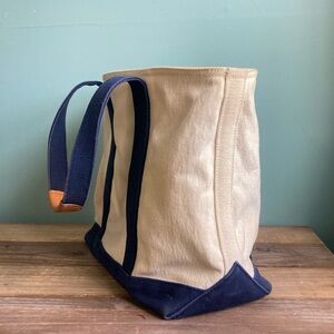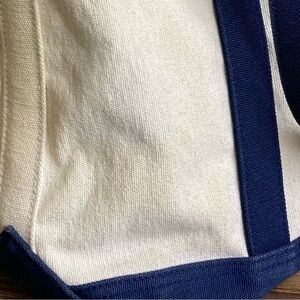 Navy blue and cream colored, constructed from heavy cotton canvas, zip closure, interior zip pocket, leather handle grips.