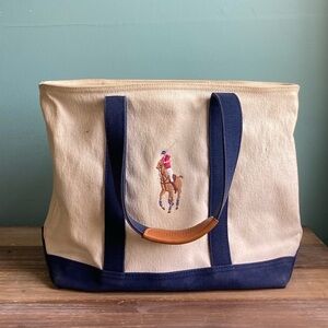 Polo Ralph Lauren Big Pony Canvas and Leather Tote Bag. Great pre owned condition, some areas of the canvas are slightly tanned due to age, some fading on the bottom, see photos for signs of wear.