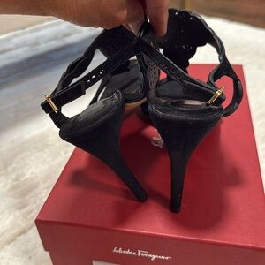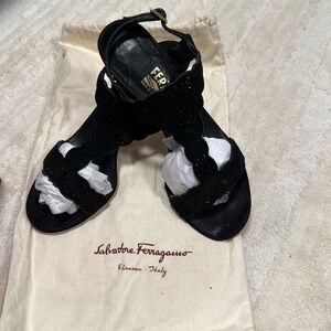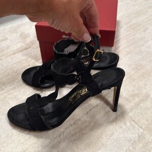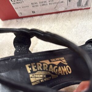 Salvatore Ferragamo Garcia black suede sandals. Size 7. Gently worn condition, light wear on soles. Dust bag and extra heel tips and box included Happy to answer questions