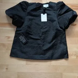Chic black blouse with a textured design. Features short sleeves. Ideal for versatile styling.