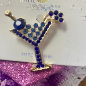 Sparkling Martini glass brooch overflowing with blue crystals with a playful splash. 1.4 in × 1.75 in. Lightweight. Adds sparkle to any collar, scarf, etc. #happyhour #cocktails