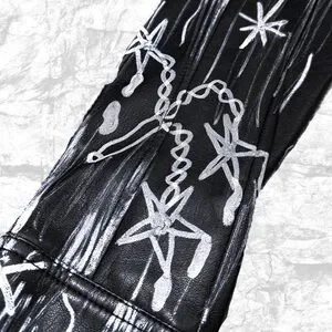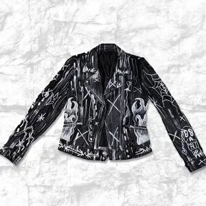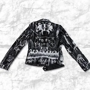 Black biker-style leather jacket with bold white hand-painted graphics. Features abstract doodles, flames, spiderweb, and sketch details. Edgy statement piece. Perfect for streetwear or layered looks.