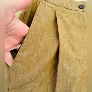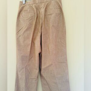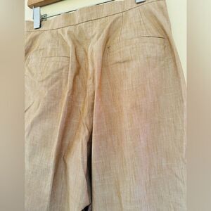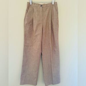 Versatile high-rise wide-leg pants in a soft tan color. Lightweight linen-blend fabric for breathable, all-day comfort. Clean front with button closure and subtle pleats for a polished look. Easy to style for work or weekend wear.